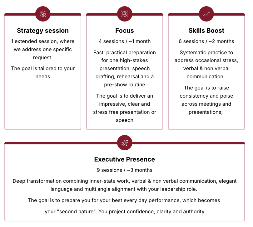 Most people reach out when the stakes are higher than usual - or when they sense they’re ready for the next level, but their communication isn’t fully matching the level of their expertise yet. A few examples: